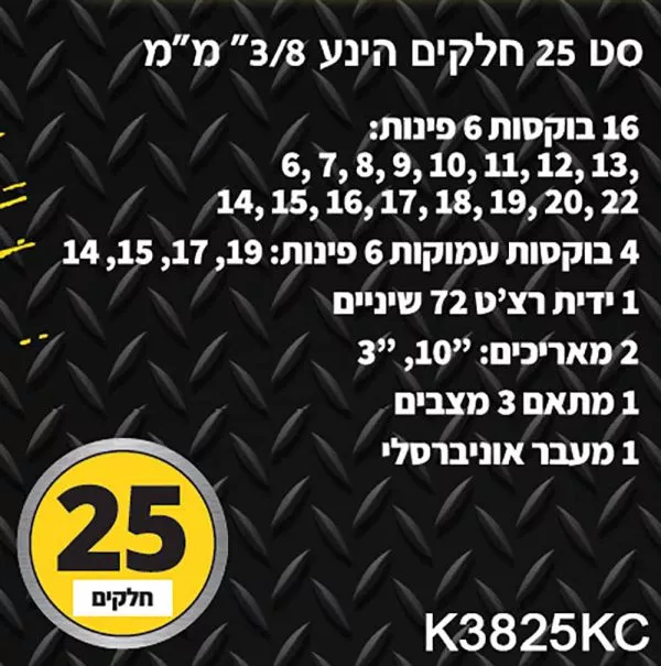 סט מעולה לכל חובבי הרכב ובכלל, מתאים למגוון עבודות בוקסות, ידיות רצ'ט ומעברים. דגם: K-3825KC