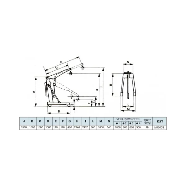 מנוף קרן תוצרת MAZZOLA , מיועד עבור הרמת כלי רכב/ מונעים/ ציוד כבד משקל. מתקפל עד כושר העמסה 1 טון. נוח לתפעול. דגם: MM1000S